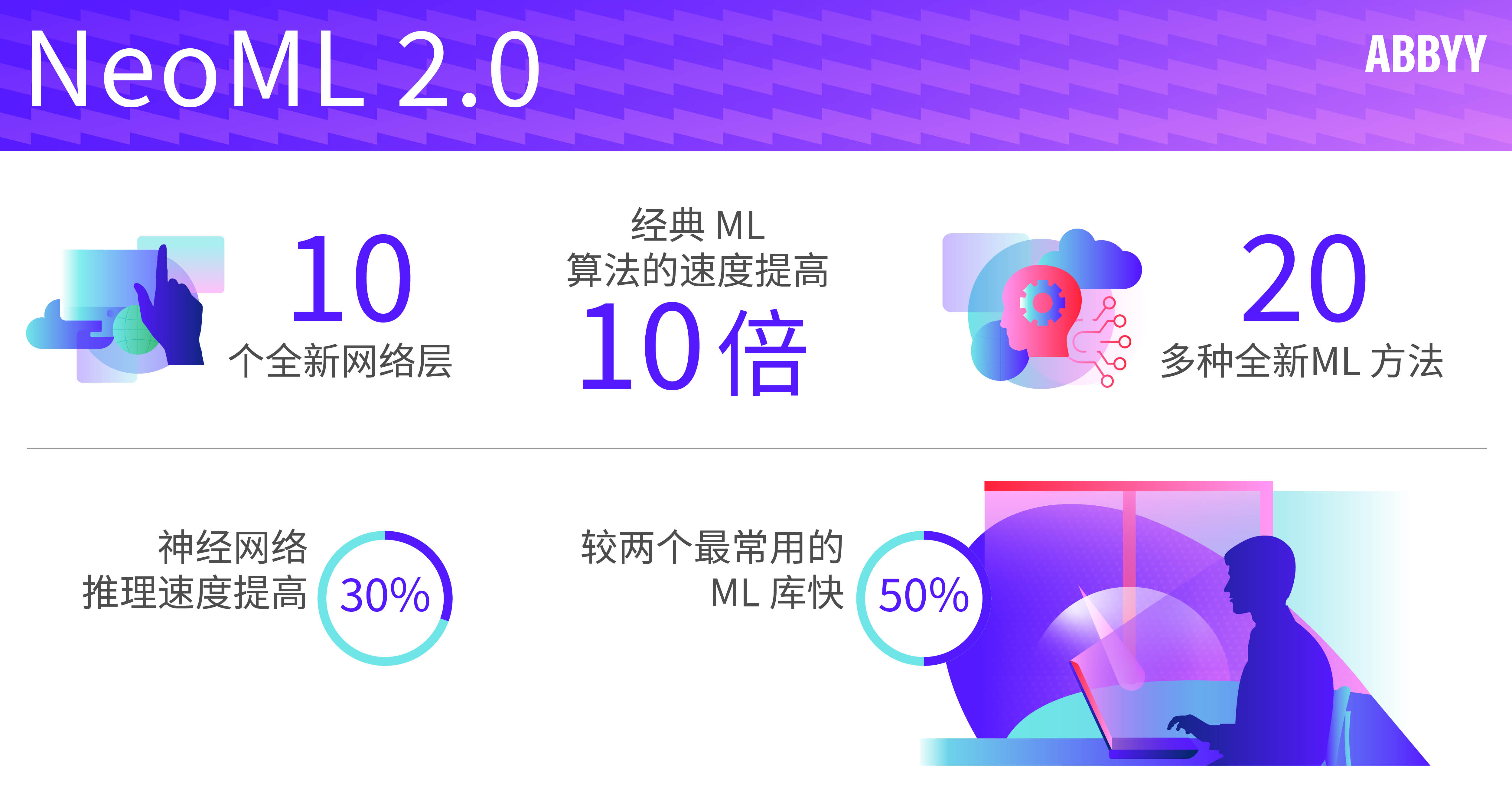 “开源是技术创新的强大动力。我们旨在通过与开发者社区合作,进一步发展和改进我们的开源库,推动人工智能向前发展。”ABBYY 产品营销高级副总裁 Bruce Orcutt 评论道,“NeoML 为开发者带来了新机遇,他们可以在利用该框架的高推理速度、平台独立性和移动设备支持的同时,进行实验、构建并推出突破性的举措。我们邀请所有的开发者、数据科学家和学术界人士使用 NeoML on GitHub 并做出贡献。”